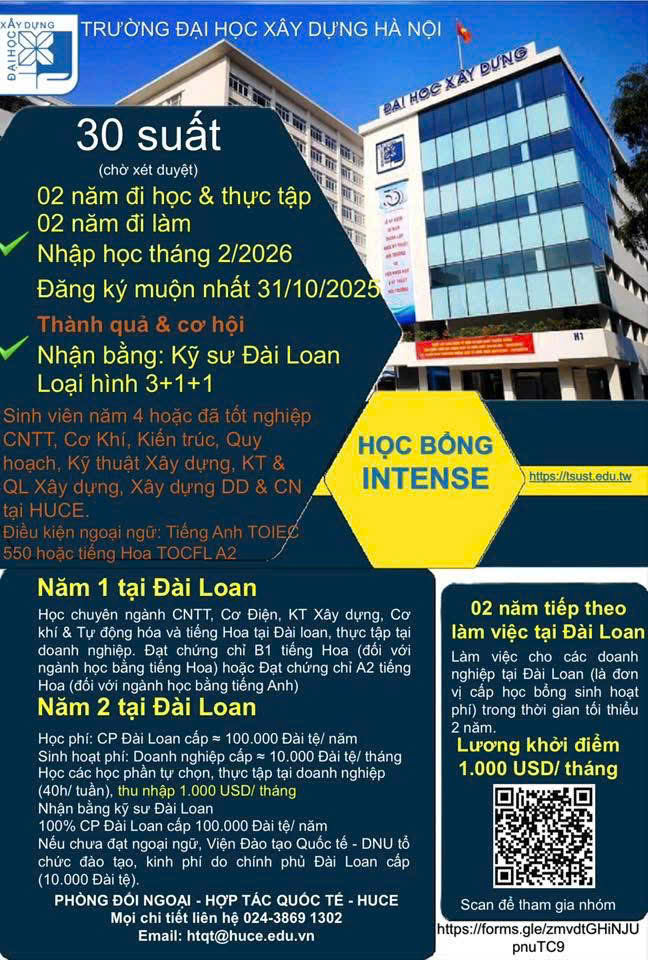 Học bổng INTENSE: Mô hình 3+1+1: sinh viên học 03 năm tại Trường Đại học Việt Nam, sau đó sang học và thực tập 02 năm tại Đại học Đài Loan, được cấp bằng Đại học chính quy của Trường Đại học Đài Loan.