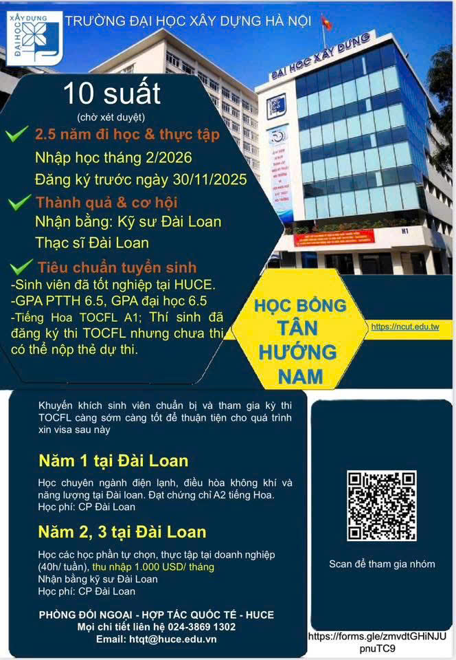Học bổng Tân Hướng Nam của Trường Đại học Khoa học Công nghệ Đài Cương (Taiwan): tài trợ học phí toàn phần.